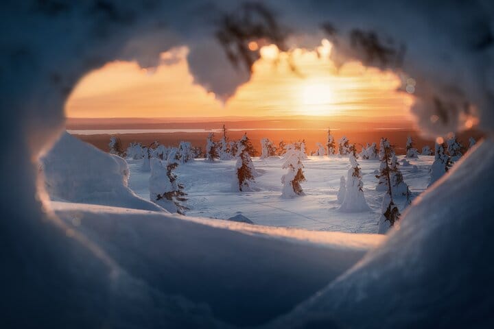 The highlight is reaching the summit, where sweeping views of frozen forests, rolling fells, and endless winter horizons open before you—a scene few visitors ever get to witness.